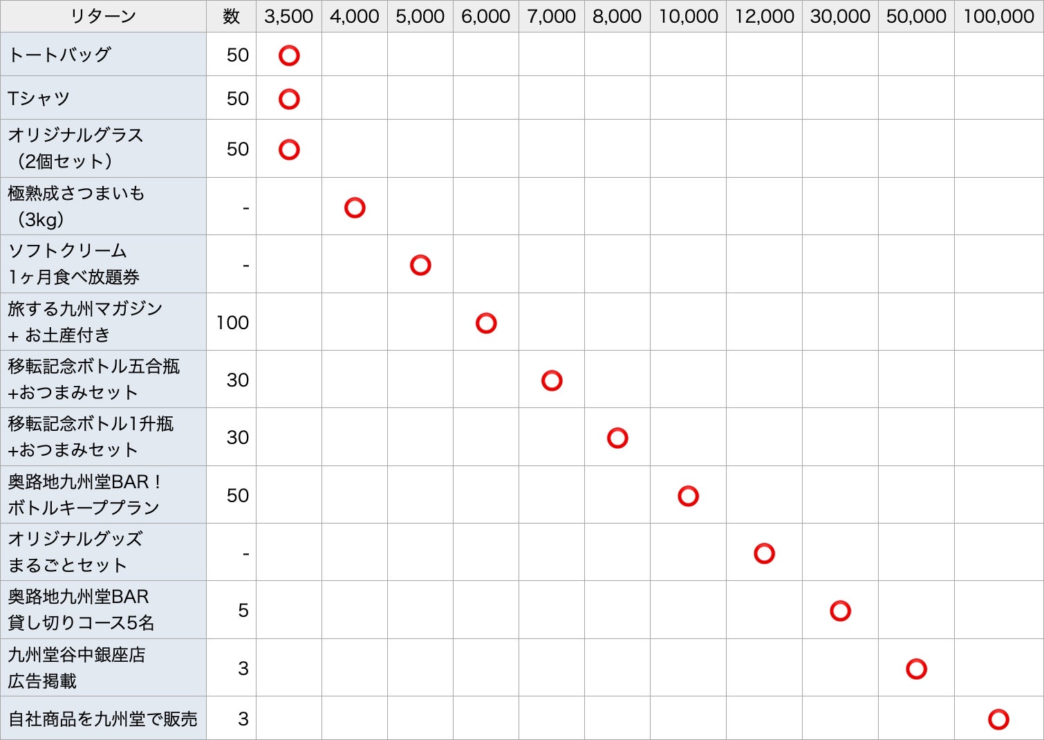 ご支援いただいた方々には、感謝の気持ちを込めて様々な特典をご用意しております。例えば、九州堂オリジナルTシャツ、トートバック、移転記念ボトル、九州旅マガジン&お土産セット、熟成さつまいも、店舗オリジナルグラス、BAR貸し切りコースに風の牧場ソフトクリーム食べ放題プランまでなど、皆様に喜んでいただけるリターンをご提供いたします。