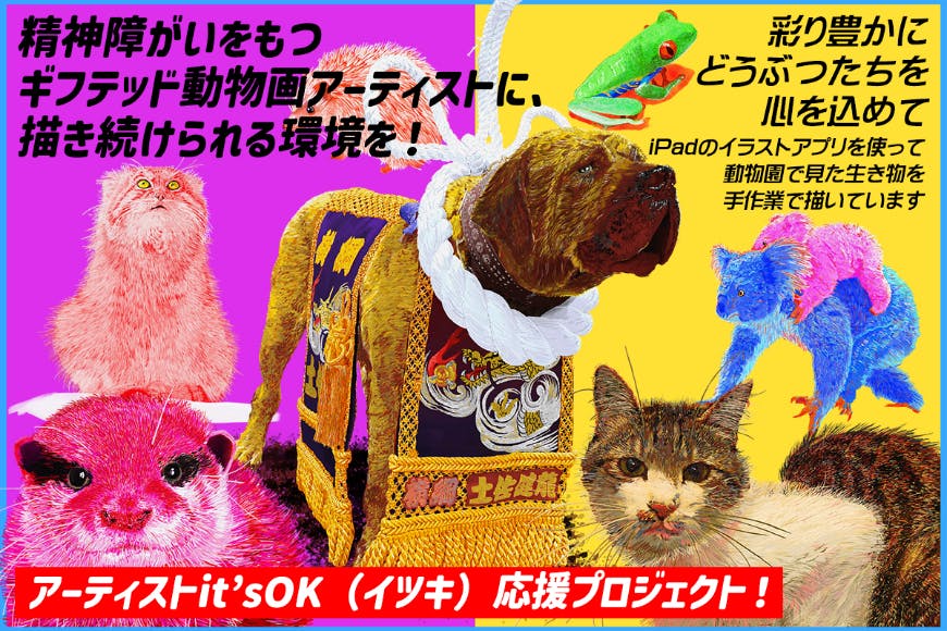 アーティストit’sOK(イツキ)が、これまで見たことがないどうぶつたちを観て、描く。そのきめ細やかさや色の鮮やかさを感じていただければ嬉しいです。そして、it’sOK(イツキ)の作品をあなたのお気に入りの場所に飾りませんか? さまざまな場所に住み、さまざまな困難に直面しているアーティストたちの活動や生活を後押しするご支援をお願いいたします。数年後、イラストレーターとして独り立ちできたit’sOK(イツキ)が、これまでに見たこともないアニマルアートを皆さまにお見せできることを願って、今日もit’sOK(イツキ)は絵を描き続けています。