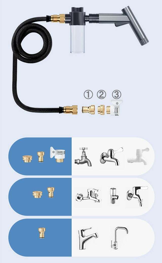 付属品:本体×1、ホース×1、メタルネジ付蛇口ニップル×1、ネジ取出しニップル×1、丸形水栓コネクター×1、洗剤タンク×1、日本語説明書×1