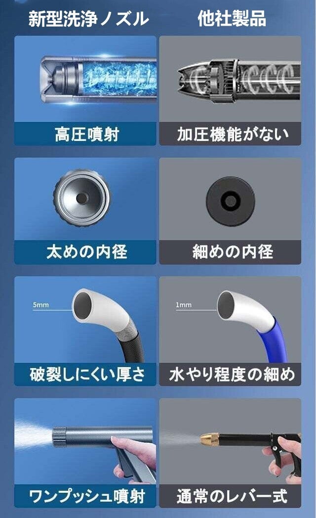 他社の市販品より、ノズルの内部構造からホースの耐久性まで、更に強化しています。