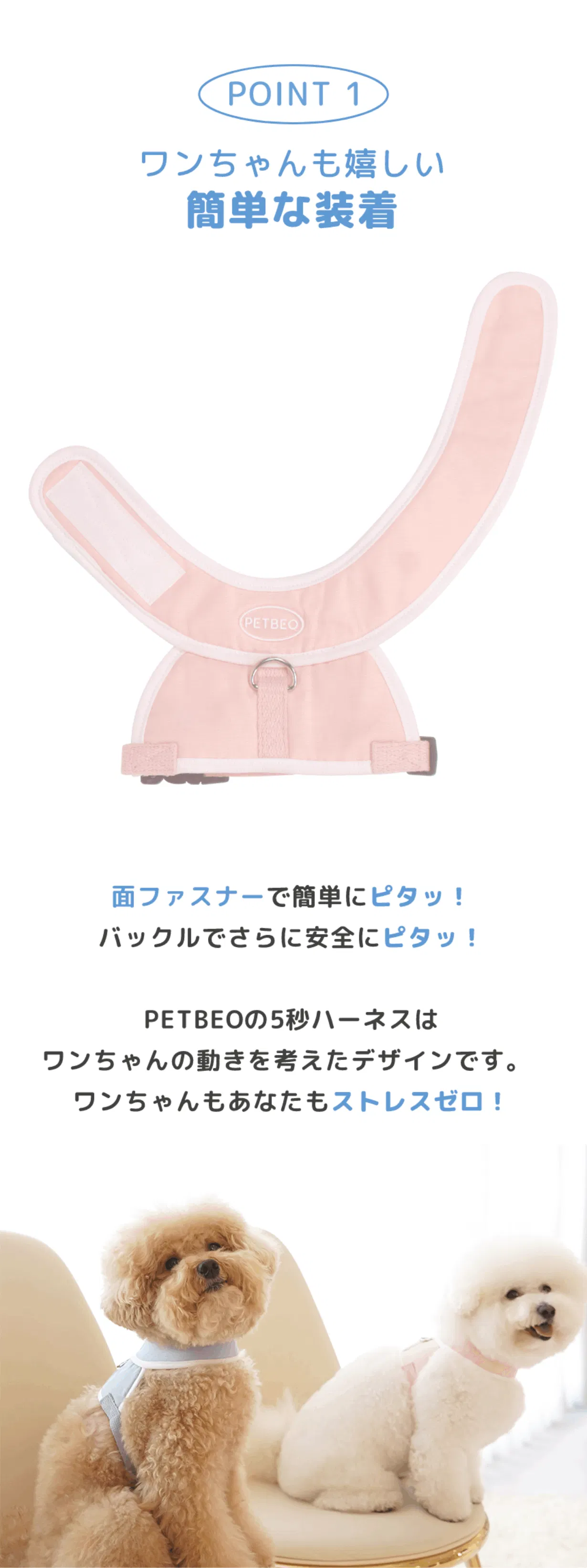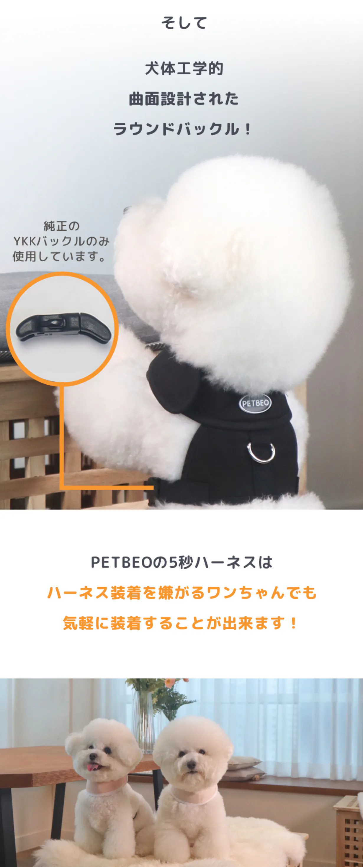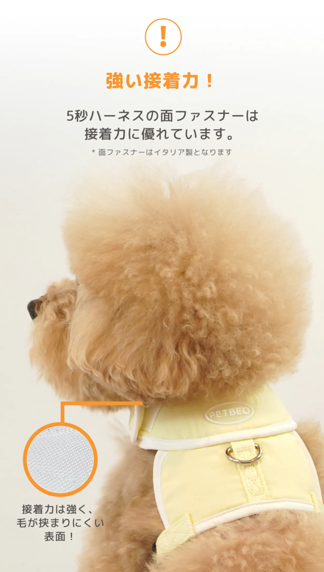 PETBEOの5秒ハーネスに使用している面ファスナーはイタリア製であり、優れた耐久性と接着力が特徴です。推奨している最低付着範囲は5cmとなります。