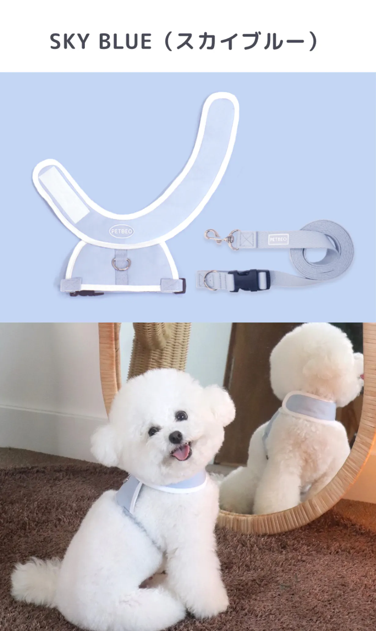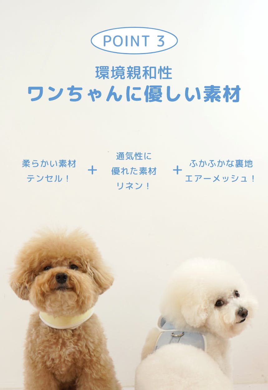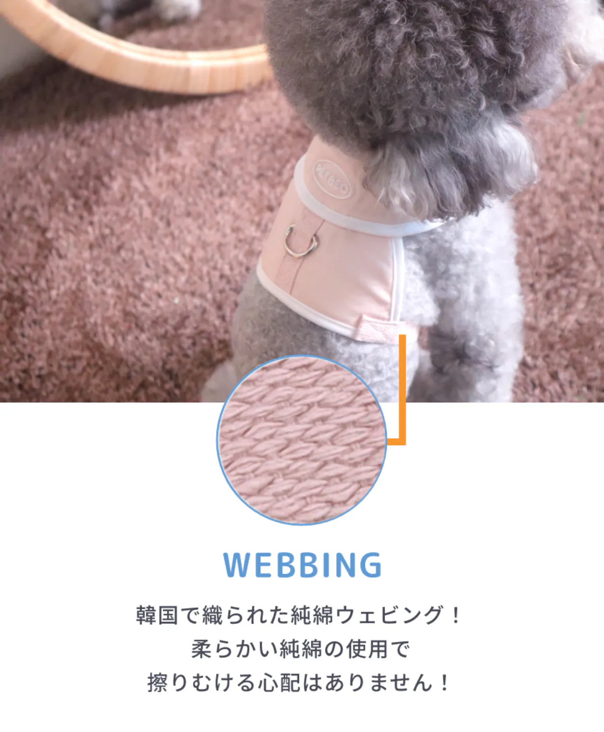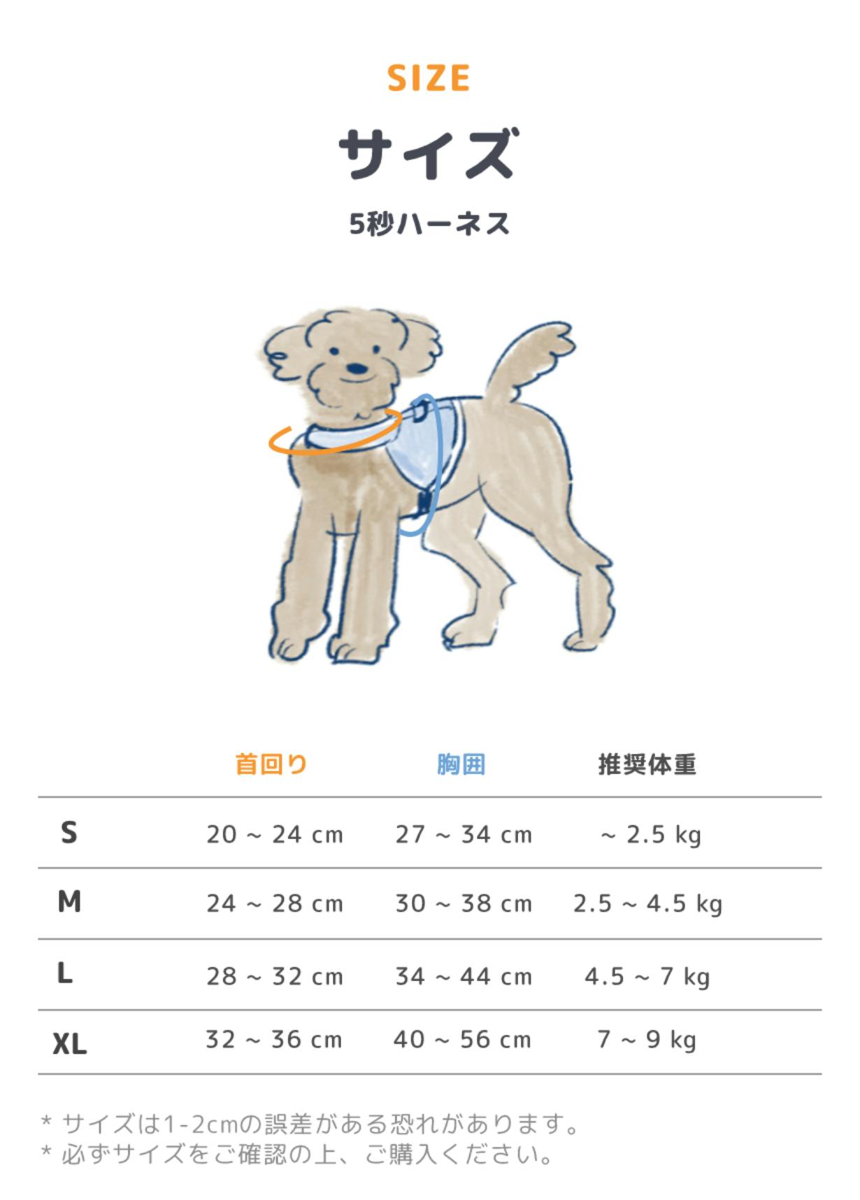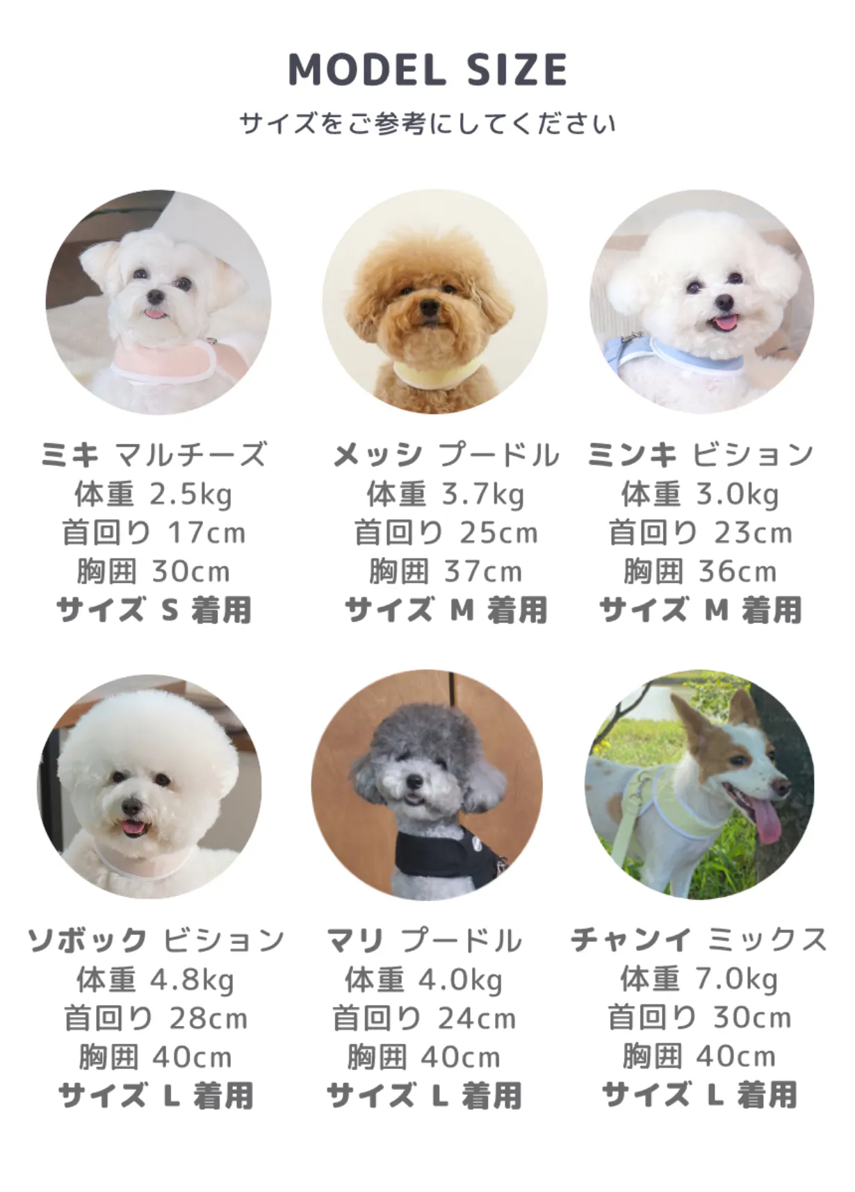 まずはサイズ表に記載されている胸囲と推奨体重をご確認の上、モデルサイズを参考にワンちゃんの体系に合うサイズをお選びください。面ファスナーとバンドは長さ調整ができますので体形に合わせて調整することが可能です。