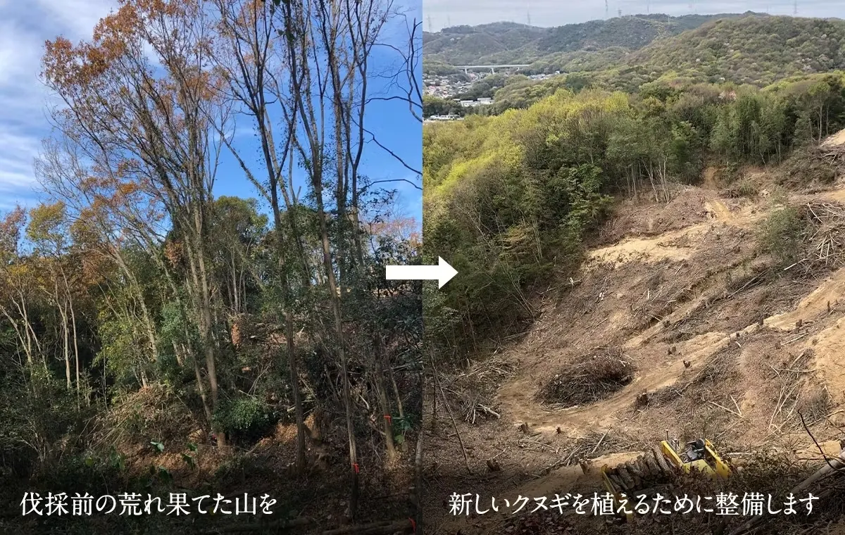 ご支援いただいたホダ木1本につき、クヌギの苗1本が含まれます。この苗木は、伐採した里山に植樹され、里山は新たな息吹を得て生まれ変わります。