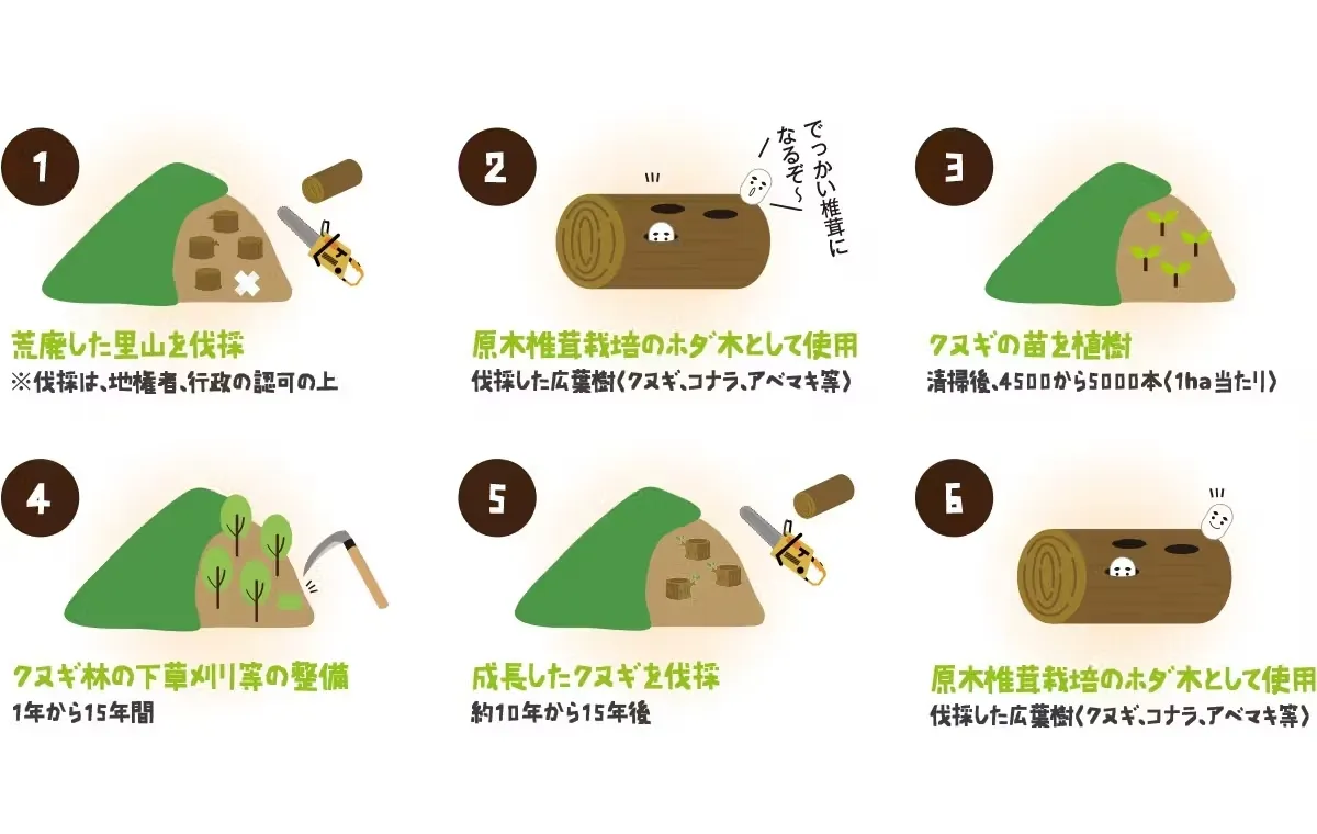 この循環型原木椎茸栽培プロセスを通じて、里山の環境を保護し、原木椎茸の持続可能な生産を実現します。
