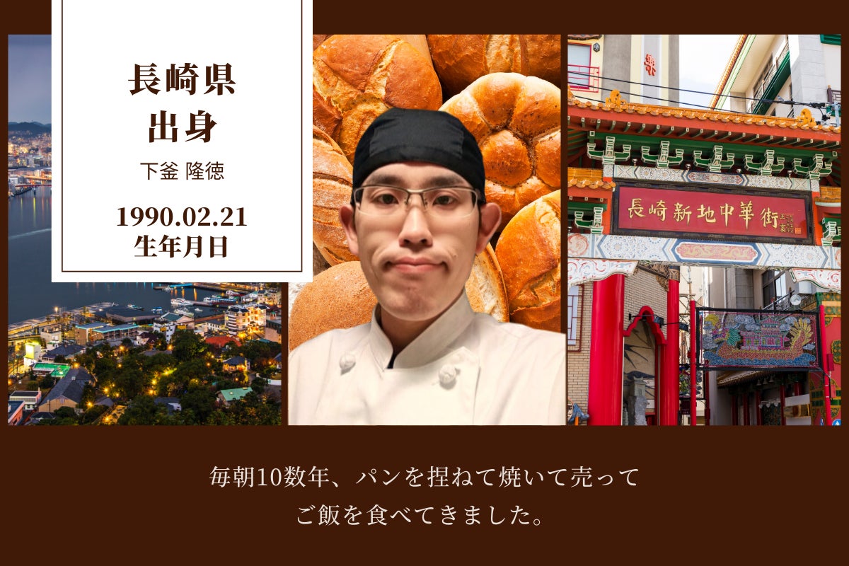 長崎県諫早市飯盛町下釜出身の九州男児、下釜隆徳(しもがまたかのり)と申します。33歳のパン職人歴は13年、パン職人YouTuber歴4年のパン職人です。高校生から食品学を学び、卒業から今までパンで飯を食べてきました。