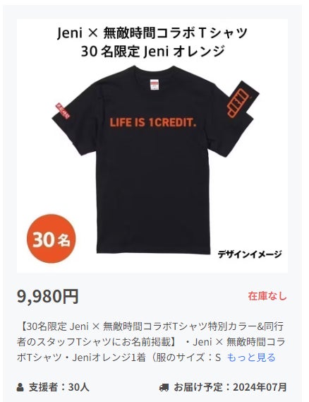 再補充について30名限定リターンをご購入いただいた皆さんにご相談したところ、補充について皆さんからどんどんやってOK!無限に作って!時間が合わなかった方への補填があった方が気兼ねなくTシャツを楽しみにできます!と皆さんから言っていただいたので、リターンの補充をすることにしました!