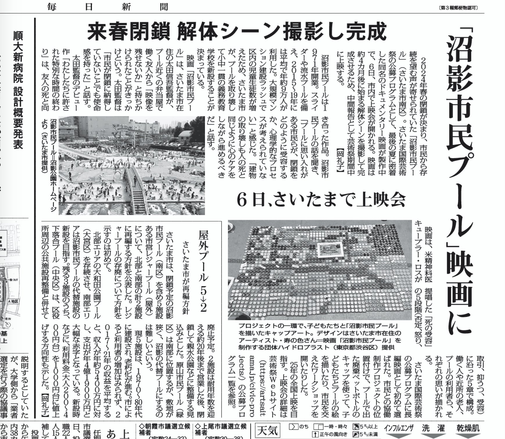 小学生の頃から暮らしてきた埼玉県さいたま市で映画を撮ろうと決意を固めたのは、ちょうど1年前の2022年冬のことでした。沼影市民プールの近くで弁当店を営む男性より、「解体される沼影市民プールを記録映画として後世に残せないか?」という相談をいただいたのです。当初、私たちとしては企画に賛同したい気持ちもありつつ、プールというプライバシーに関わる場での撮影は許可が降りないだろうと難しさを感じていました。しかし、沼影市民プールの所長さんをはじめ、利用者の方・近隣の皆さまの賛同やご理解をいただくことができ、プールでの撮影を許可いただくことができました。また、さいたま市が募集をした「さいたま市レジャープールのあり方方針(案)」パブリックコメントにはさいたま市発足以来、過去2番目の多さとなる710名から905件のコメントが寄せられるなど、地域のプールへの関心の高さも再認識することができました。