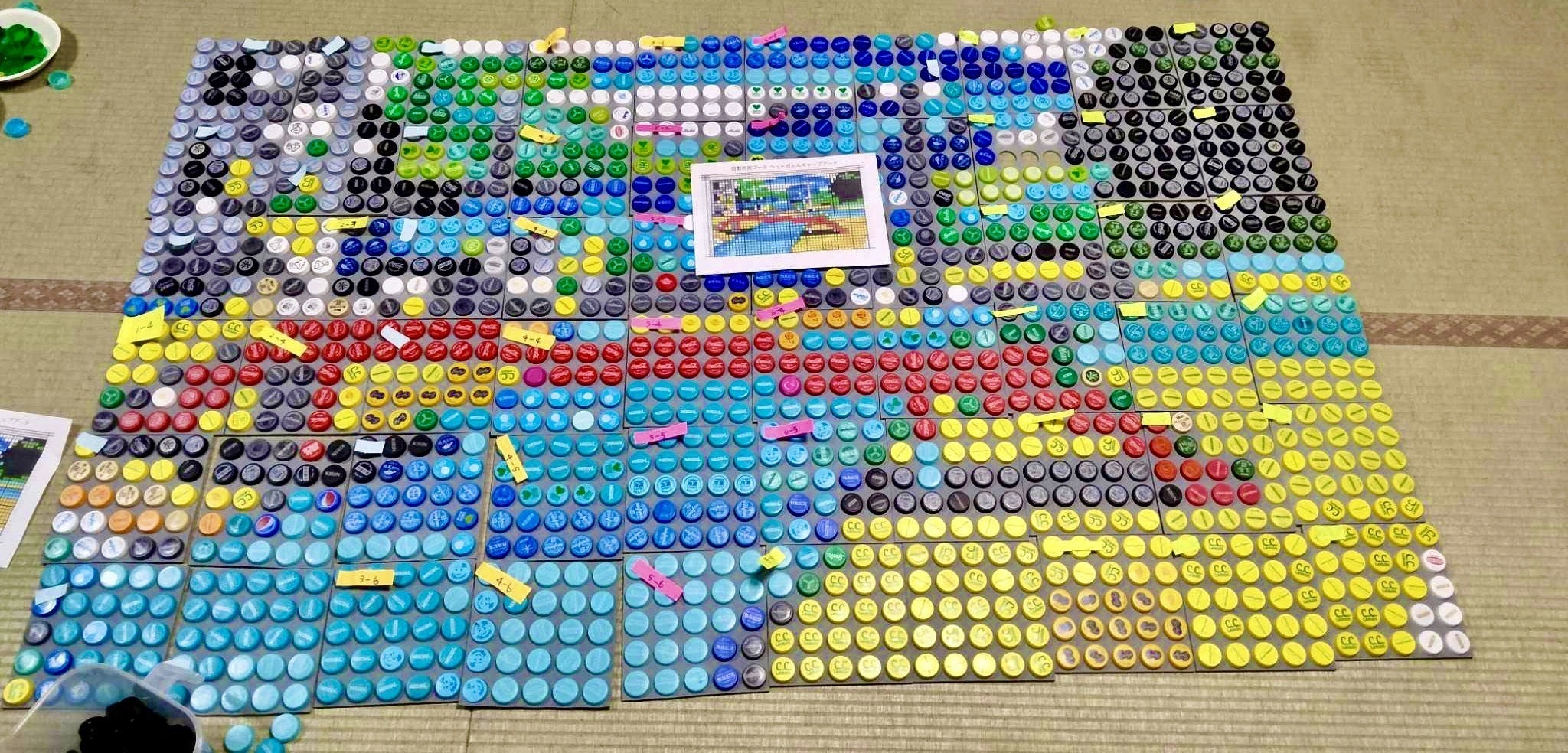 また、市内の学童保育NPO「太陽の家」の子供たちとプールで出た廃棄廃棄ペットボトルのキャップを使ったキャップアートの制作を進めております。デザインは、さいたま市在住のアーティスト寿の色さんにお願いいたしました。今月初めの毎日新聞でも取り組みを取り上げていただき、今後の活動にも期待が寄せられています。