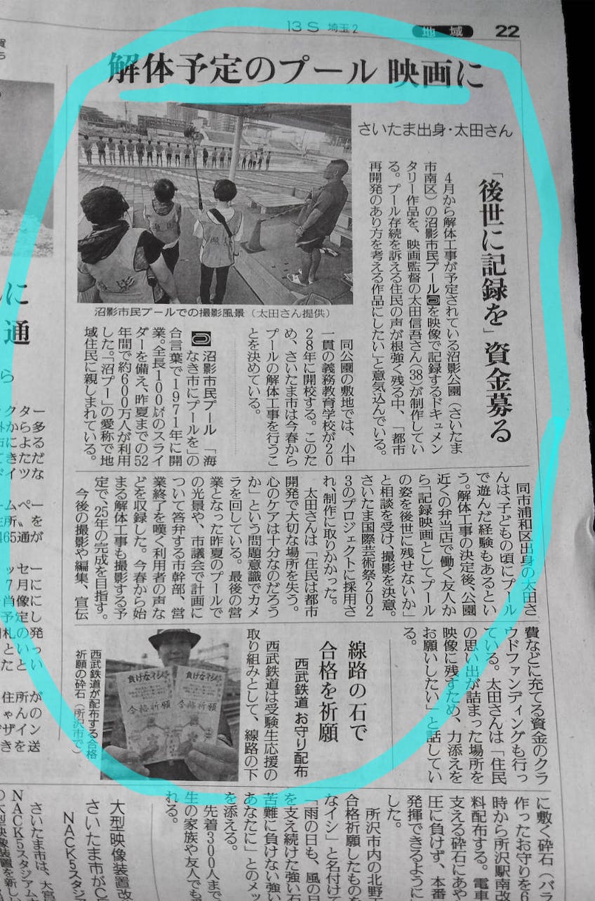 本日の読売新聞朝刊に映画『沼影市民プール』監督の太田信吾さんに関する記事が掲載されました!!太田監督は、沼影市民プールが解体の危機にあることに対して、「住民は都市開発で大切な場所を失う。心のケアは十分なのだろうか」と言及しています。