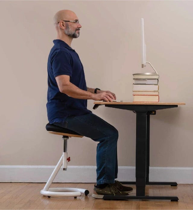 A:一般的なチェアの「正しい姿勢」は、90度の腰・90度の膝・90度の足首の姿勢です。しかしこの姿勢は背骨にとって不自然で痛みを伴う姿勢となります。 シートの上端と膝のお皿の上部が一直線になるようにします。この高さは、一般的なチェアに座る時に比べやや高いと感じるかもしれませんが、膝を開いて座ることで、背骨の自然なカーブが保たれます。