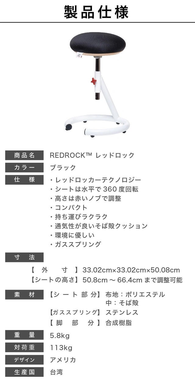 また、「REDOROCK レッドロック」は「REDROCK レッドロック」は座面を固定せずあえて不安定な状態にしています。バランスボールに座る時をイメージして下さい。重心を前にして、慎重に座ってみたあとご自身の心地の良い姿勢になるまで、ゆらゆらしてみて下さい。「REDROCK レッドロック」は座面を固定せずあえて不安定な状態にしています。重心を後ろにした状態のまま座るとバランスを崩しそのまま転倒する可能性があります。座面が揺れますので、座り方にご注意下さい。
