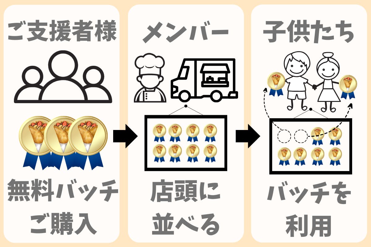 子供たちが無料でクレープを1つ食べれる"無料バッチ"を購入していただき、子供たちはそのバッチを利用してクレープを無料で食べることができるという支援になります。