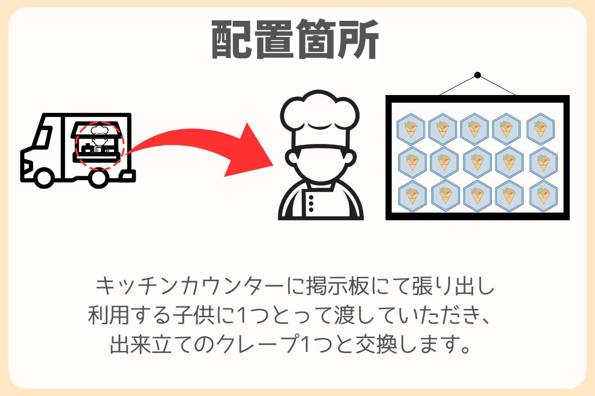 一般のクレープ販売も行いながら、店頭にバッチも置きバッチを利用する子供たちに無償で提供をしていきます。