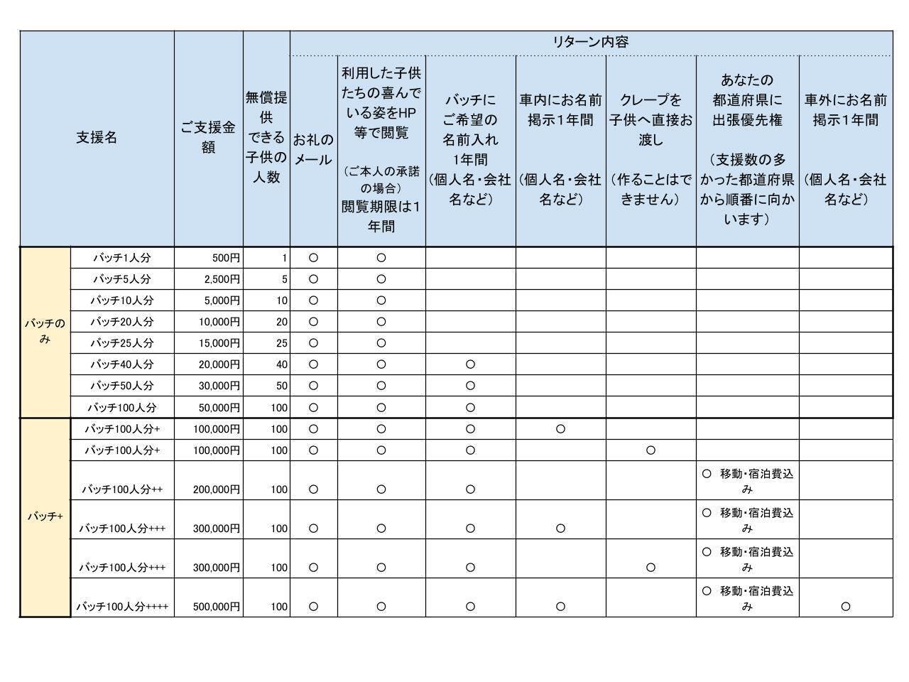 ご支援いただきますリターンつきましては下記をご参照ください。