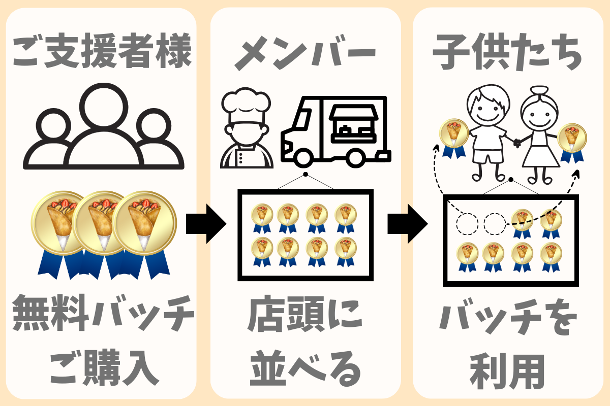 子供たちが無料でクレープを1つ食べれる"無料バッチ"を購入していただき、子供たちはそのバッチを利用してクレープを無料で食べることができるという支援になります。