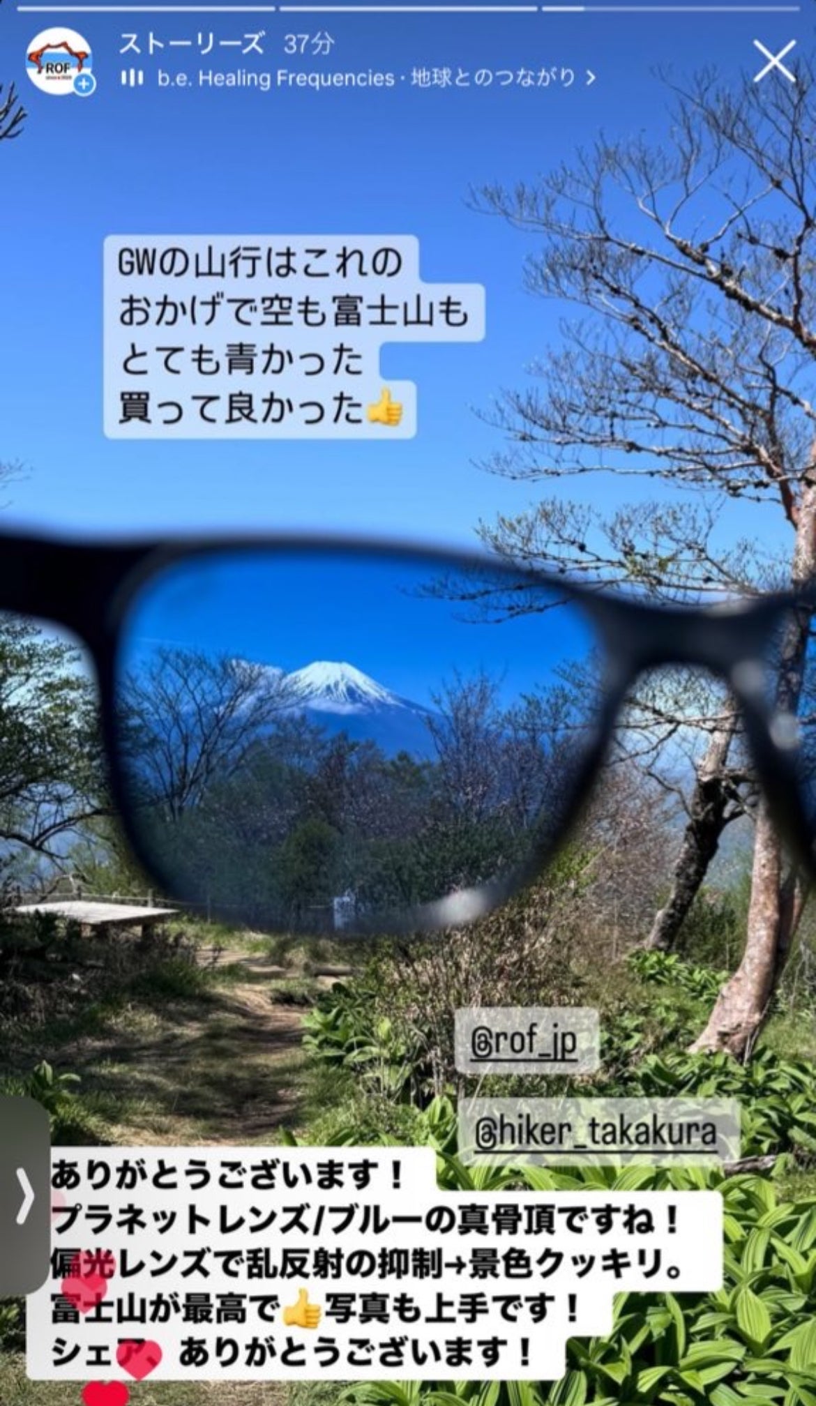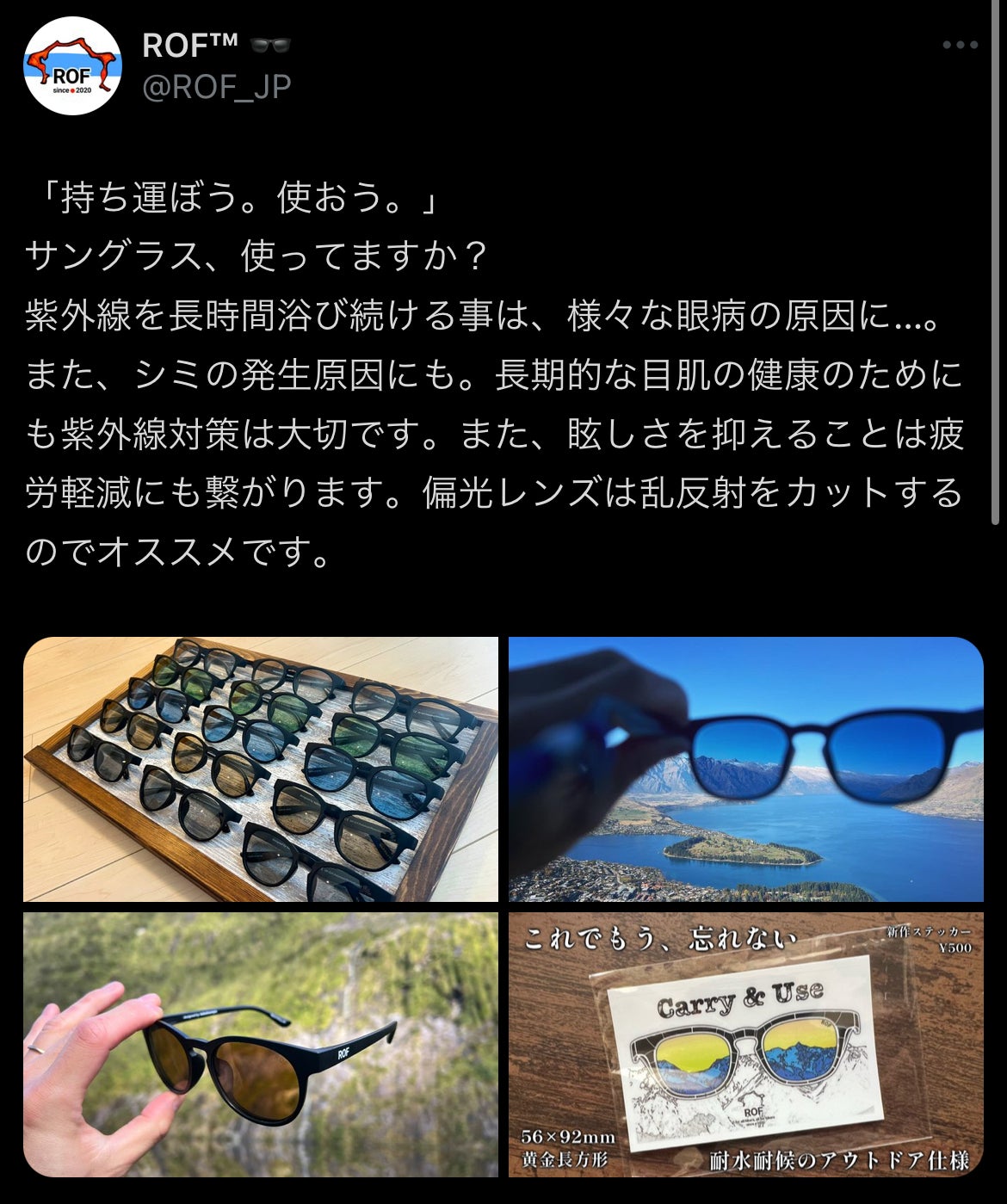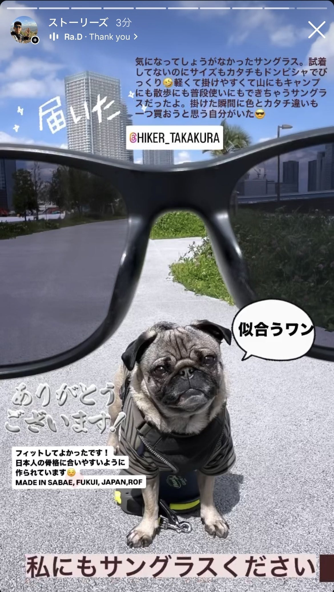 ⭐︎⑧のサングラスの使用感想は必須となります。今後の製品開発に繋げるべく鯖江の職人さんに伝えたり、私からのシェアに活用させていただくことがございます。一言でもご感想をいただけますと非常に励みとなり、SNSシェアは自分からもしやすくありがたいです。
