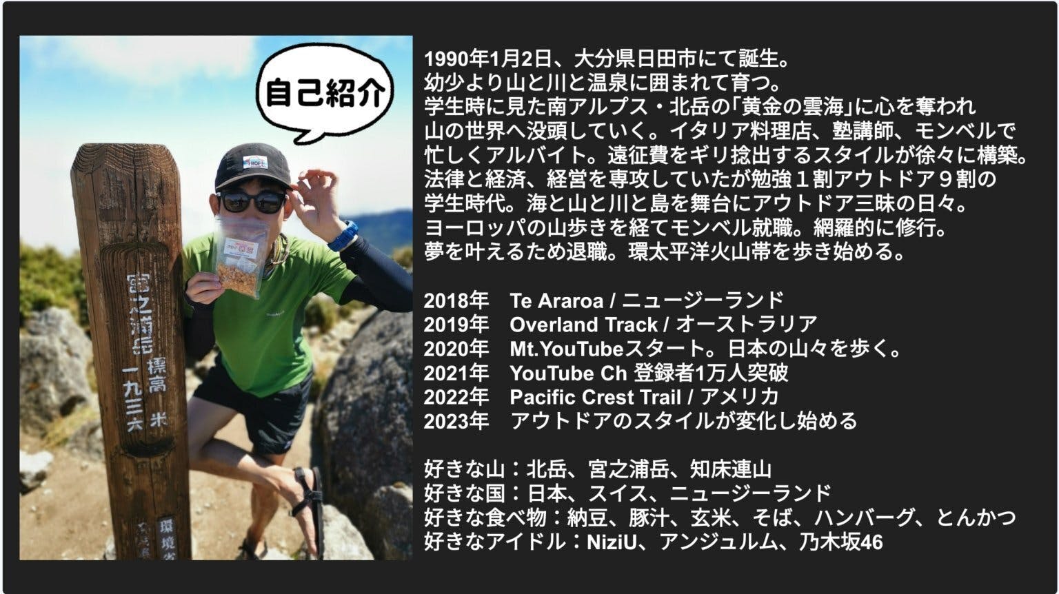 「森や山、自然の世界が大好きでアウトドアに20年ドはまり→YouTubeを主な舞台として様々な表現活動を行うロングトレイルハイカーとして活動→その最大の気付き『健康に勝るものはない』をシェアしている人間」です。