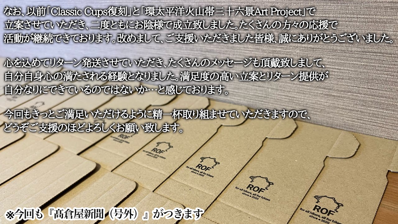 髙倉屋新聞とはROFプロダクトをご支援いただいた方にお届けさせていただいております怪文書のような近況報告の会報誌です。山と旅、ロングトレイル、歩くことから学んだことを皆さんに独特な文体と世界観でお届けさせていただいております。