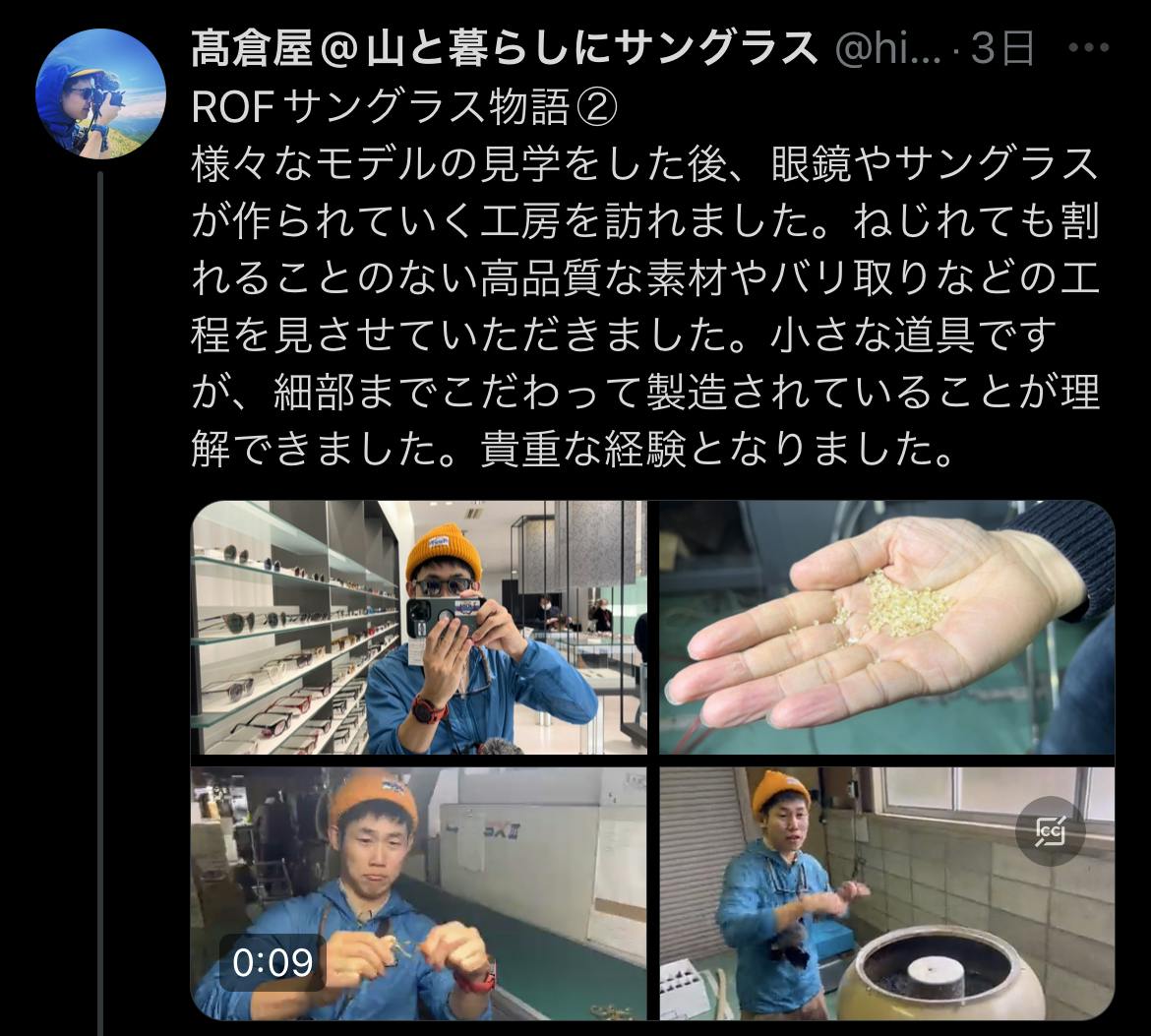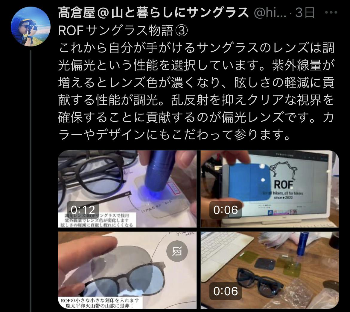 2024/05/01 20:04こんばんは。毎度お馴染み流浪のハイカーたかくらでございます。皆様いかがお過ごしでしょうか。健康第一で楽しく暮らせておられますでしょうか。自分はサングラスのお届けや東京イベントを経て、ニュージーランドへの長期登山遠征準備をしつつ元気に楽しく生かしていただいております。東京イベントでは、自分なりに深めてきた登山とロングトレイルの経験から人生に還元できる発見や、後世に伝えたい自分なりの後悔、自然=アウトドアの面白さと怖さ、一度きりの自分の人生に挑戦するということ、精神修養と人格形成の道、上質な暮らしとバランス感覚、健康に勝るモノはない・・・など、自分らしく話したい放題に表現させていただきました。ご来場いただきました皆様、誠にありがとうございました。4月のイベントを4月に告知して、そんなにご来場は見込めないかも・・・と思いながらでしたが、おかげさまで80名を超えるお客様に恵まれました。自分の活動が継続できるのは皆様のお陰です。本当にありがとうございます。(少し会場が狭く暑かったかもしれませんね。申し訳ありません。告知のタイミングから会場サイズ、展示スペースなど諸々次に活かして参ります)当日はサングラスの試着と即売会もあり、好評いただきました。もっとサングラスの話を聞きたかったとのお声もいただきましたので、次にこのようなイベントごとがあるときは、サングラス置き場でアツく語らせてください。試着もお手伝いします。お手元には届きましたでしょうか?リターンにサングラスが含まれる場合の発送を全数終えております。皆様、お手元には届きましたでしょうか?そして、たくさんのシェアを誠にありがとうございます。到着報告ももちろん嬉しいですし(無事に届いたんだ!と安心します!)、実際にアウトドアで使っていただいている様子も、とても嬉しく思います。本当にありがとうございます。今後もXやインスタグラムでシェアしていただけましたら、飛んでリポストしに行きますので是非よろしくお願い致します。皆さんからアウトドアビタミンをいただいております!※アウトドアビタミンとは、目に見えない心の栄養で、主に自然の世界やアウトドア関連の投稿を見ると摂取できます万一届いていない場合発送には万全を期しておりますが、万一まだ届いていない場合は、発送経路上において何らかのトラブルが発生している可能性が考えられます。もし「まだ届いてないぞ髙倉!」な方がいらっしゃいましたら、お手数おかけしますが、こちらのメールアドレスまでご連絡くださいませ。お詫びの上、即時対応させていただきます。rof.sunglasses@gmail.comGW中の特別優先販売についていよいよ一般流通が始まります。開始記念とGW連休を合わせて特別優先受付を開始しました。もし「予備にもう一本」や「他のレンズも試してみたい」という方がいらっしゃいましたらご連絡くださいませ。こちらの動画で解説しています。一点ずつ心を込めて梱包しております。気持ちが伝わっていたら嬉しく思います。U.L.サングラス紐の注意点もし万一サングラス紐の白いパーツが脱落した時は、こちらの手順で付け直ししてくださいませ。YETI DESIGNとの別注コラボカラーとなりますので、こちらの資料を引用しております。何度もすいませんが、注意点高温多湿環境、水気を帯びた状態での長期間にわたる放置は製品寿命を縮めます。レンズの剥離につながりますので、特にこれからの季節「車内での保管は絶対にお避けください」。大切に長くご愛用いただき、皆さんのアウトドアLIFEのお供をさせていただけたらと考えております。第2弾「LONGTRAIL」始動までカウントダウン開始今回のプロジェクトはROFのサングラス物語の序章に過ぎません。Daily/Hike は日常生活から気軽なハイキングに使いやすい基本カテゴリとなる展開で、今後Longtrailカテゴリ、Mountainカテゴリ、EXtremeカテゴリと展開は拡大していきます。皆さんに「応援し続けたい!」と思っていただけるように精一杯頑張って参りますので今後もどうぞよろしくお願い致します。髙倉屋 もっと見る