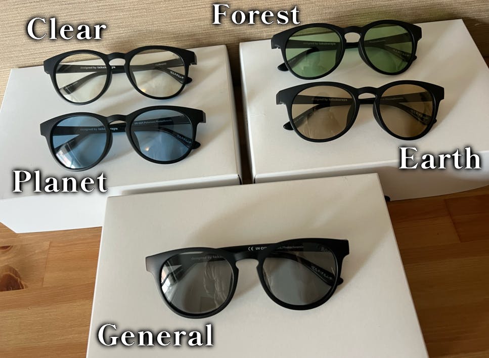 今回レンズカラーは色々と使用シーンを想定し、5色提案致します。材質はプラスチックです。