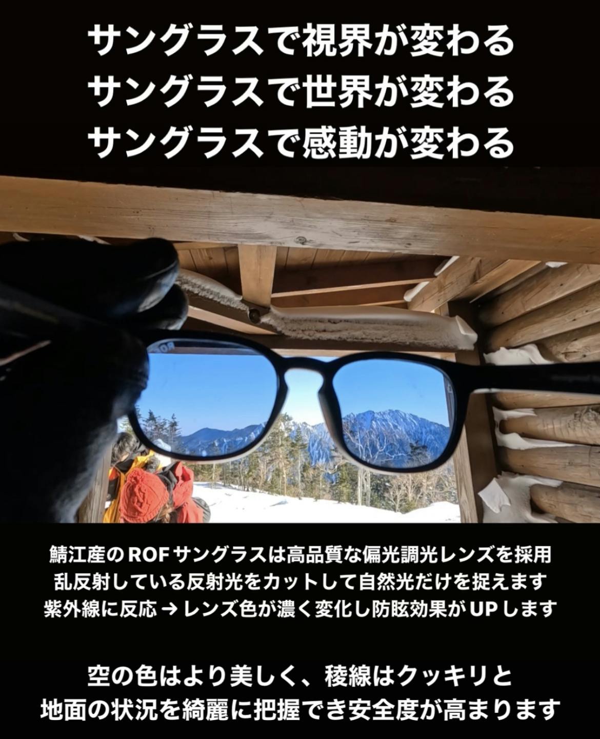 サングラスで世界が変わる。ちょっと大袈裟な響きに聞こえますが、自分は体感しております。五感のなかでも視覚から得られる情報の多さはダントツで、絶景を見たときの感動や、活動の安全度UPにも大変貢献します。