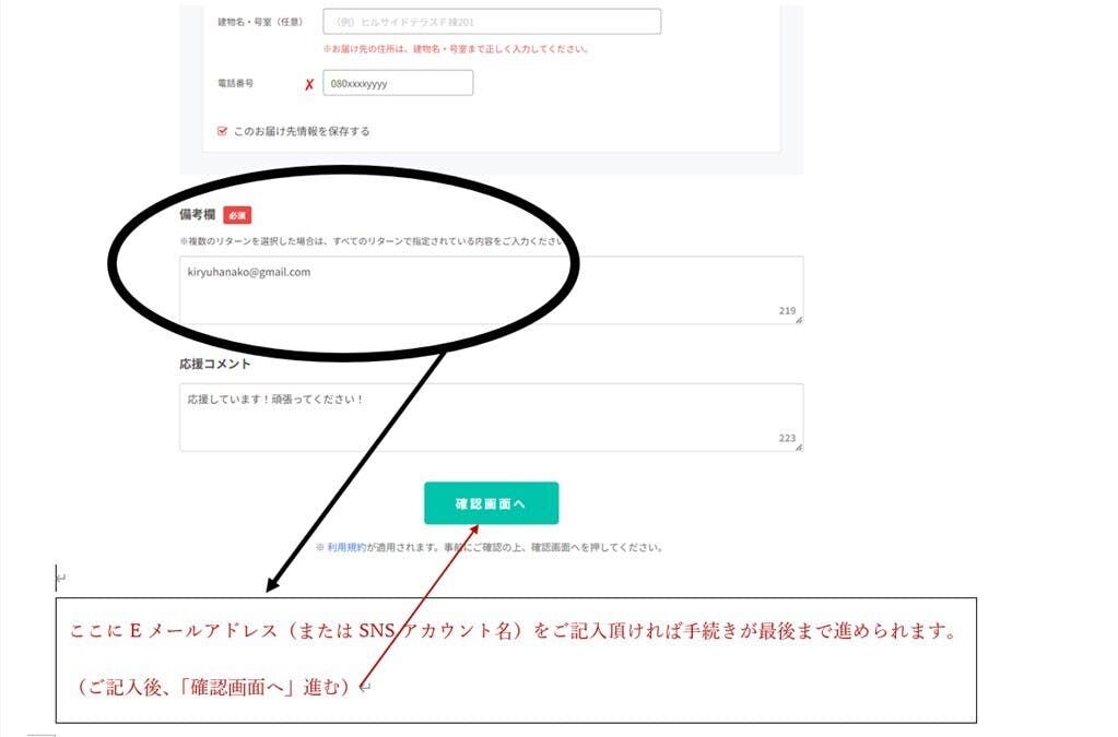 スマホあるいはPCからご支援いただく際に「備考欄」にEメールアドレスか、SNSアカウントを記載いただかないと手続きが終了しませんので、ご留意いただければ幸いです。