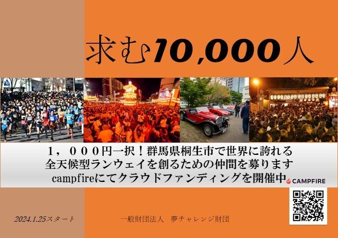 みなさま、ご協力ありがとうございます。お蔭様で100名にご賛同いただきました。我々は地方都市・桐生での大きなムーブメントを創出したいので金額もさることながら特に人数にこだわっております。趣旨をご理解いただき、本案件を拡散頂ければ幸いです。