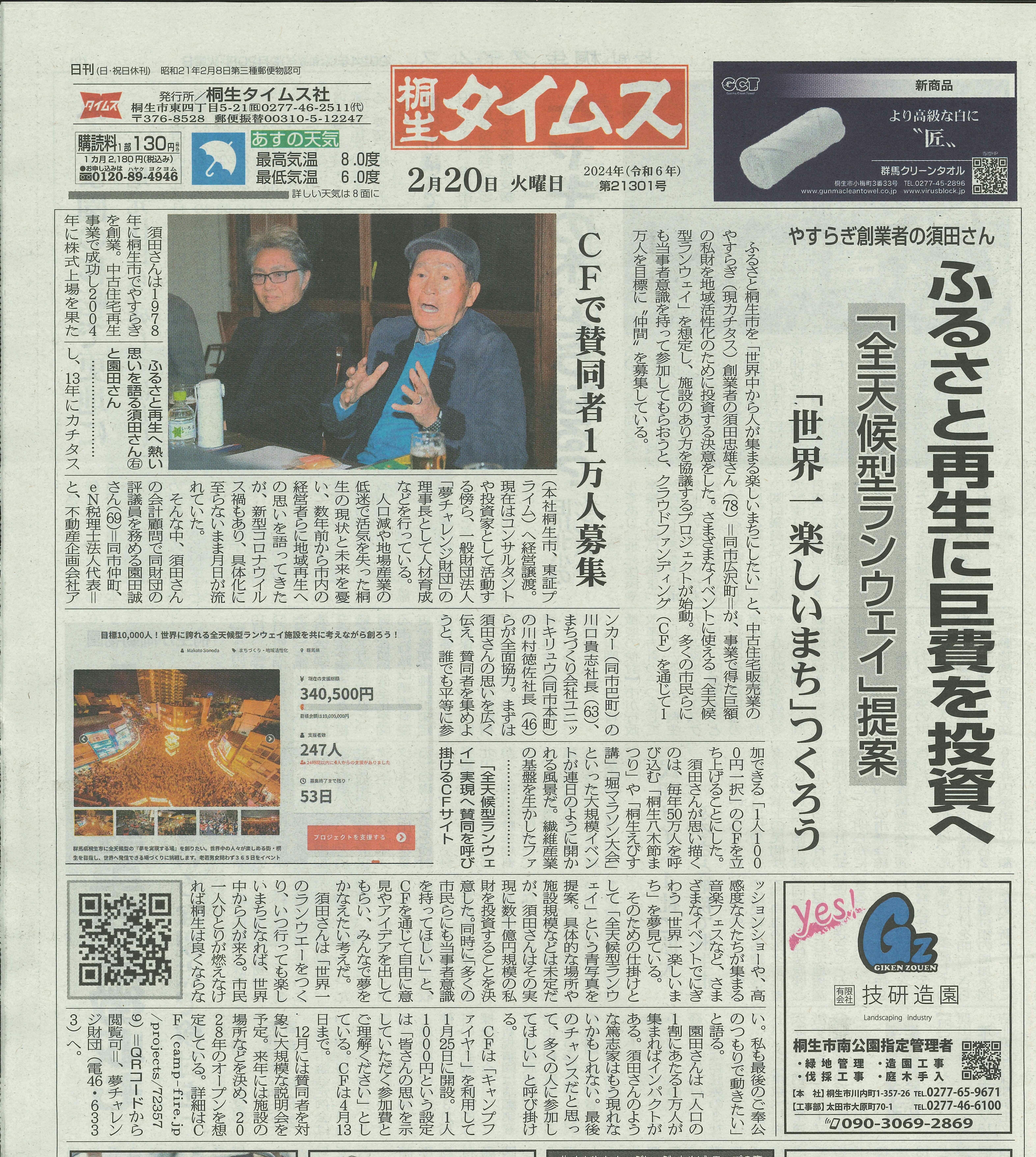 2024/02/21 02:29今回のプロジェクトへのご協力誠にありがとうございます。地元の桐生タイムス様に取り上げていただきました。非常に簡潔に分かりやすく表現頂いております。我々は引き続き1万人目指して頑張りますので宜しくお願い致します! もっと見る【クラファンに参加したいがやり方が分からなくてお困りの方へ】