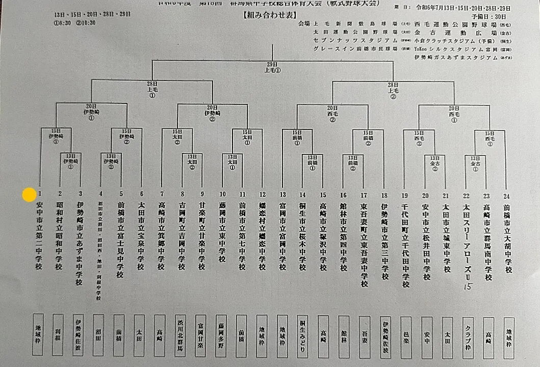 2024/07/11 07:02いつも安中二中野球部を応援して下さり、誠にありがとうございます。中体連夏季大会 安中予選にて優勝することが出来たため、今週末より中体連夏季大会の群馬県大会が始まります。ここまで頑張ってきた安中二中野球部の集大成となります!練習の成果と、気合いと、運と全てをぶつけて、悔いのない大会とし、一分一秒でも長くこのチームで野球を続けられるように頑張ります!ーーーーーーーーーーー7/15(月) 県大会試合開始:2回戦 第1試合 8:00~対戦相手:昭和中 or あずま中場所:セブンナッツスタジアム(伊勢崎市民球場)〒372-0002 群馬県伊勢崎市堤西町41 華蔵寺公園内応援、よろしくお願いします! もっと見る