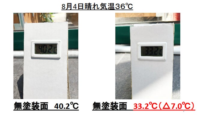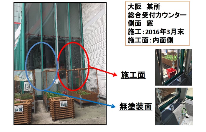 施工後、5か月程度かけて効果の実証を行いました。 その結果・・・未施工のガラスと比較して、最大約7度の温度差がありました。