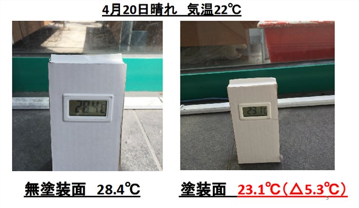 ここからの画像は旧コーティング剤での検証結果です。今回のe-coating HSGではさらに遮熱性能はアップしています。
