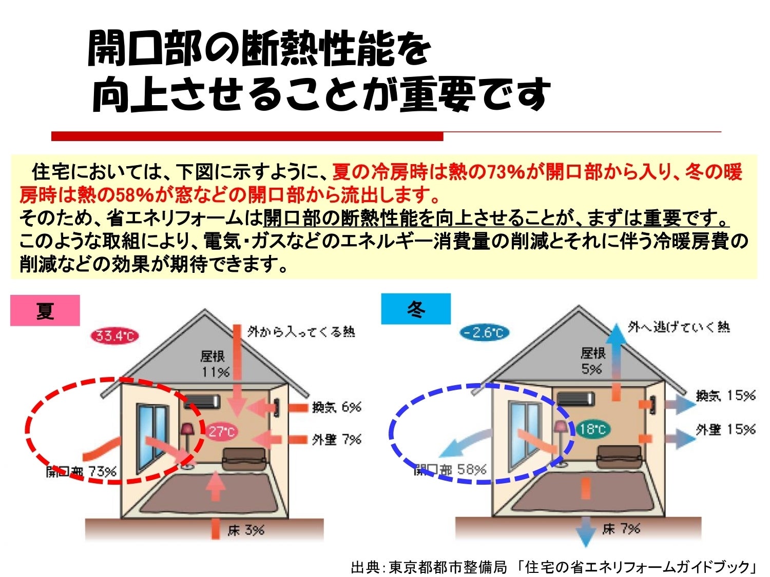 上の図のように、夏場は全体の熱の73%が窓から入ってきますので