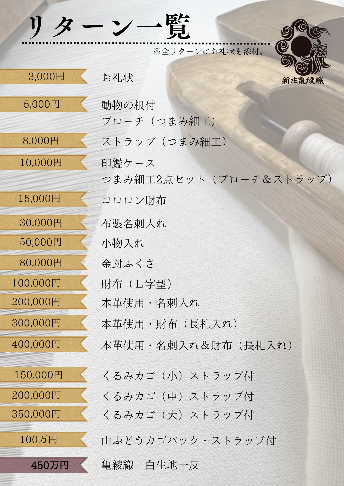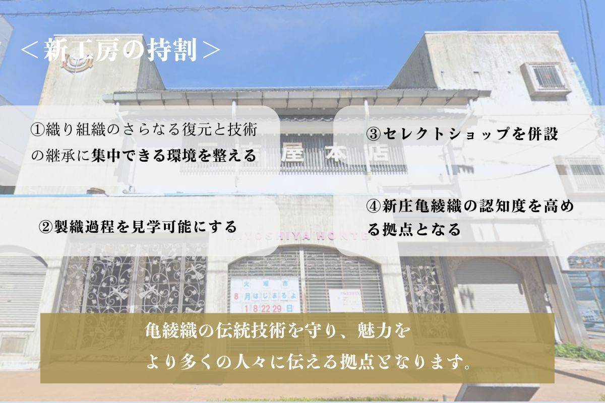 このプロジェクトを通じて、「新庄亀綾織」を広く知っていただき、伝統工芸の継承と発展に貢献できるよう、皆様のご支援とご理解を心よりお願いいたします。