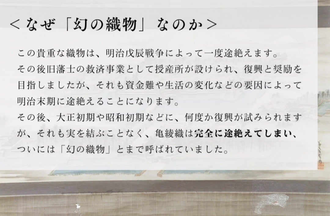 山形県新庄市における伝統ある、そして、幻の織物とよばれた「新庄亀綾織」は、斜文織(綾織)の高度な技術を要する手織りの最高級絹織物であり、全国的にも大変珍しく貴重なものであり、国内外に発信すべき価値あるものと考えております。