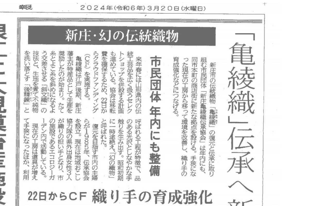 オンライン記事>>幻の伝統織物「亀綾織」伝承へ新拠点を整備 山形・新庄の市民団体が年内にも開設 | 河北新報オンライン (kahoku.news)
