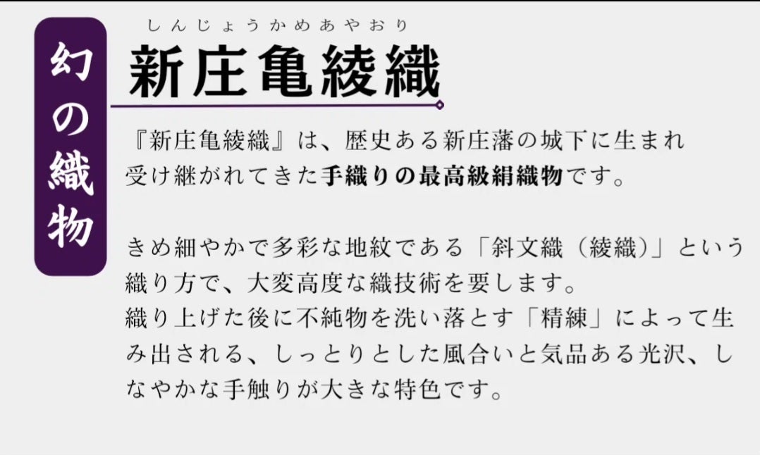新庄亀綾織は、手織りの最高級絹織物です。
