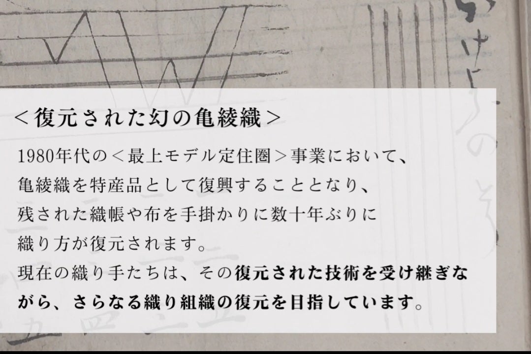 新しい工房は、亀綾織の伝統技術を守り、魅力をより多くの人々に伝える拠点となります。復元された技術を受け継ぎながら、さらなる織り組織の復元を担う、織り手へのご支援を何卒よろしくお願いします。
