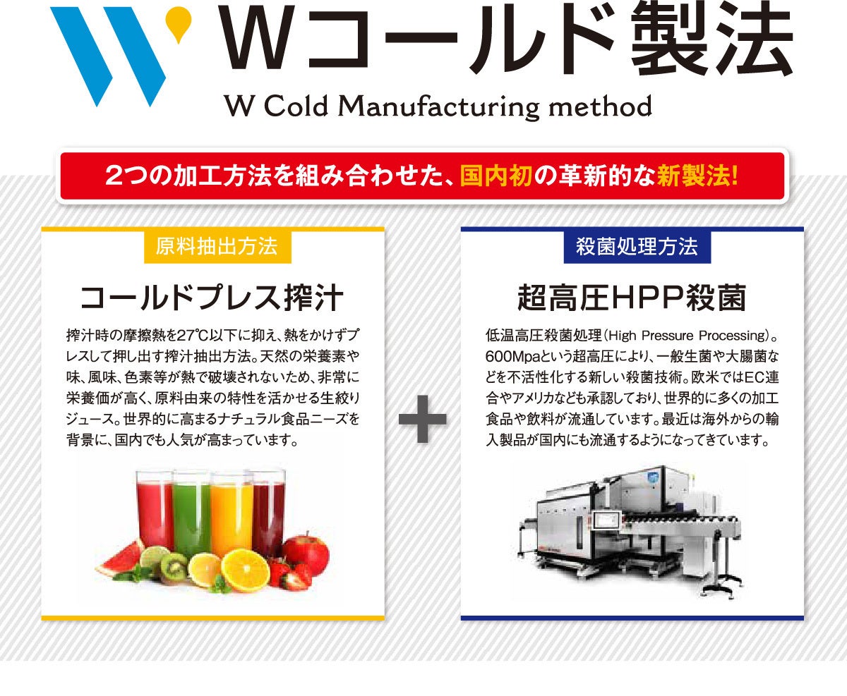 野菜が持つ甘みや酸味、香りなどの自然の風味や栄養素をダイレクトに味わうため、低温で加工する「コールドプレス粉砕・搾汁」と、超高圧で殺菌する「超高圧HPP殺菌」を用いた非加熱加工「Wコールド製法®️」を採用。