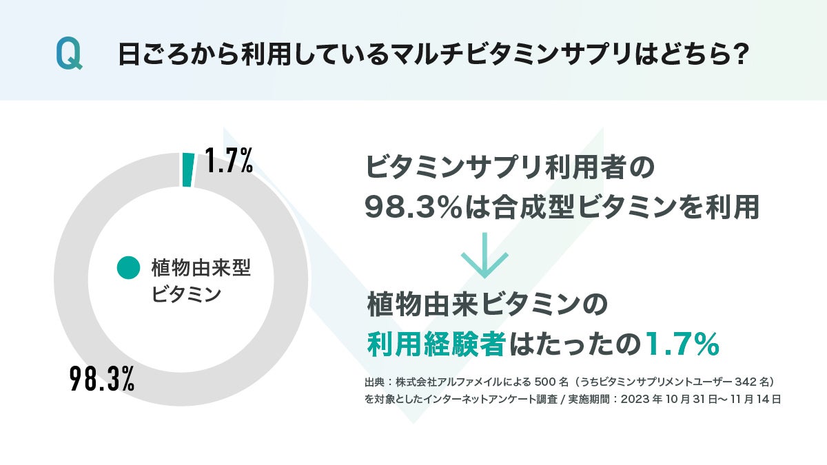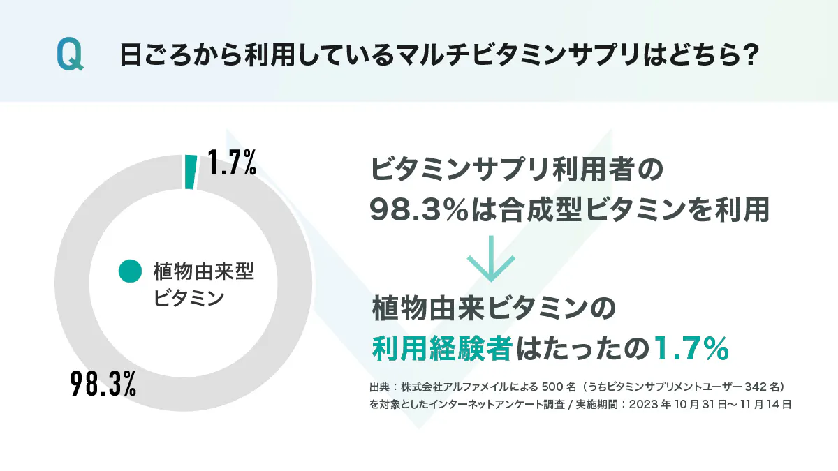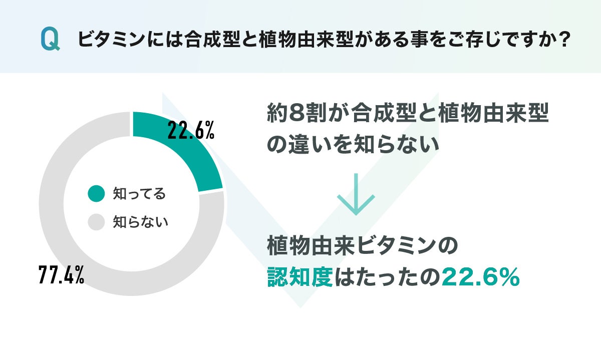 上記のようにビタミンサプリ利用者の約8割がビタミンに合成型と植物由来型の2種類がある事を知らないという事実が判明。