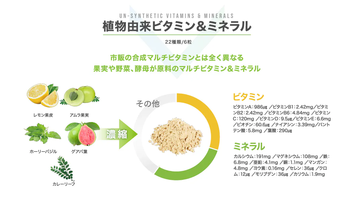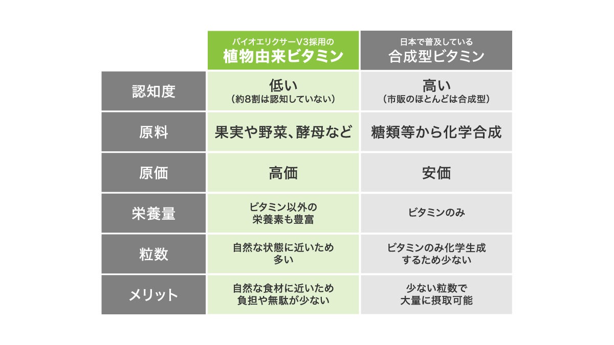 バイオエリクサーV3はよりナチュラルな食事に近い栄養供給によるコンディション最適化を目的に、植物由来のビタミン群を採用。