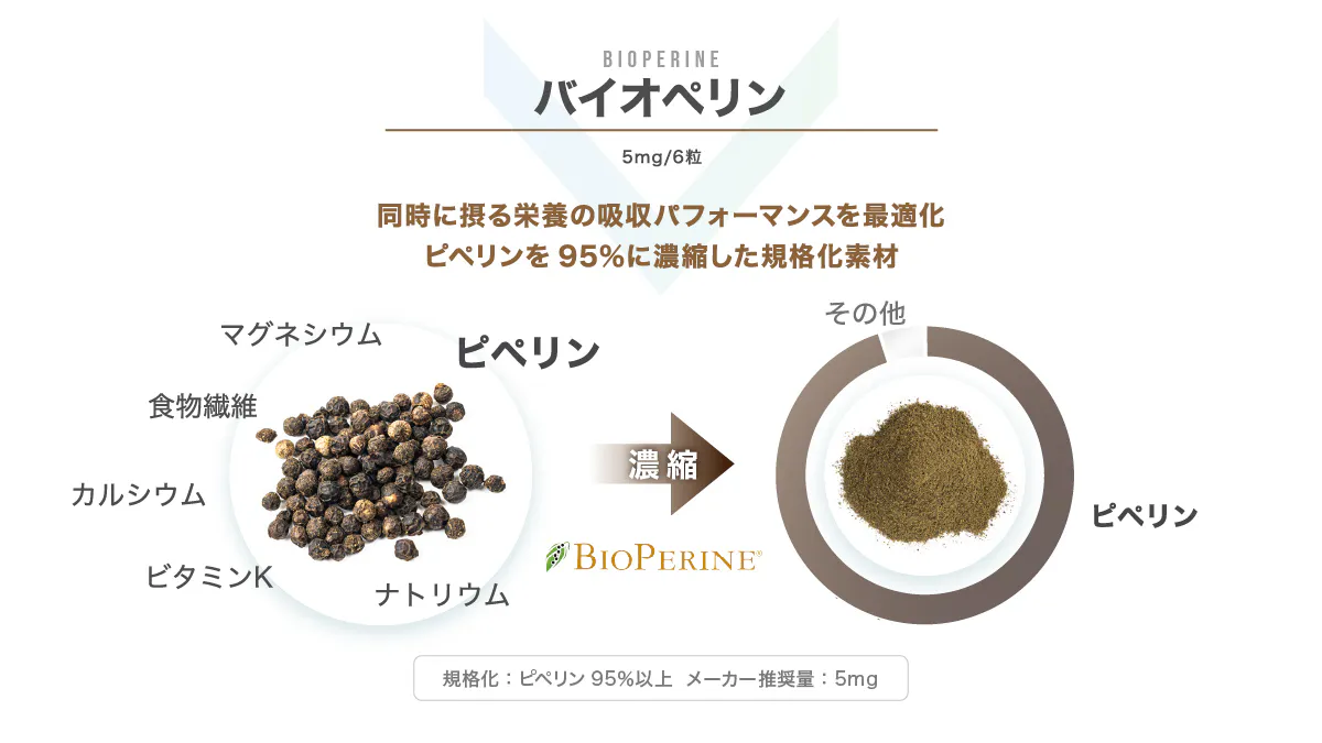 栄養は経口摂取しても、当然その全てを吸収できるわけではありません。より効率的な栄養のデリバリーと吸収をサポートするための素材バイオぺリンを採用しております。