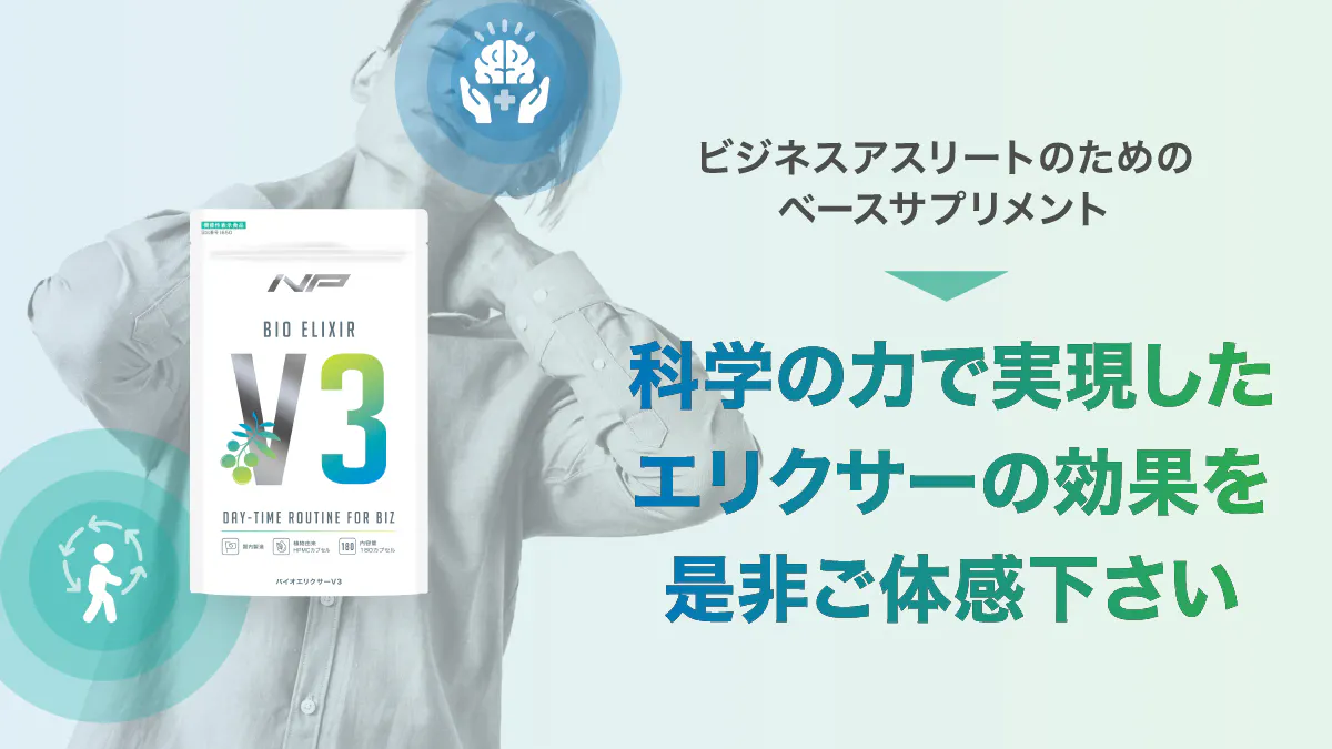 バイオエリクサーV3はそんなプロフェッショナリズムを持つビジネスマンに向けたリカバリーニュートリション。