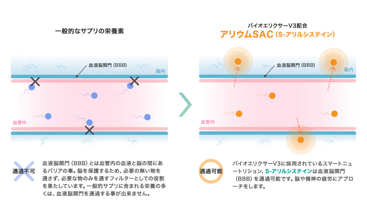 バイオエリクサーV3が採用をしているアリウムSAC(S-アリルシステイン)はこの血液脳関門を通過出来る特徴がある事が確認されております。