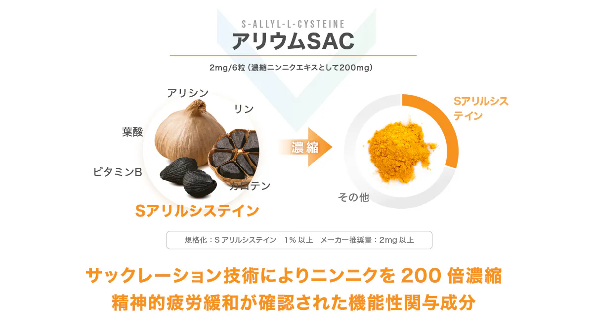 ●ヘルスクレーム:S-アリルシステイン(SAC)は、注意力や思考力などを使う作業による一時的な精神的疲労感を軽減することが報告されています。