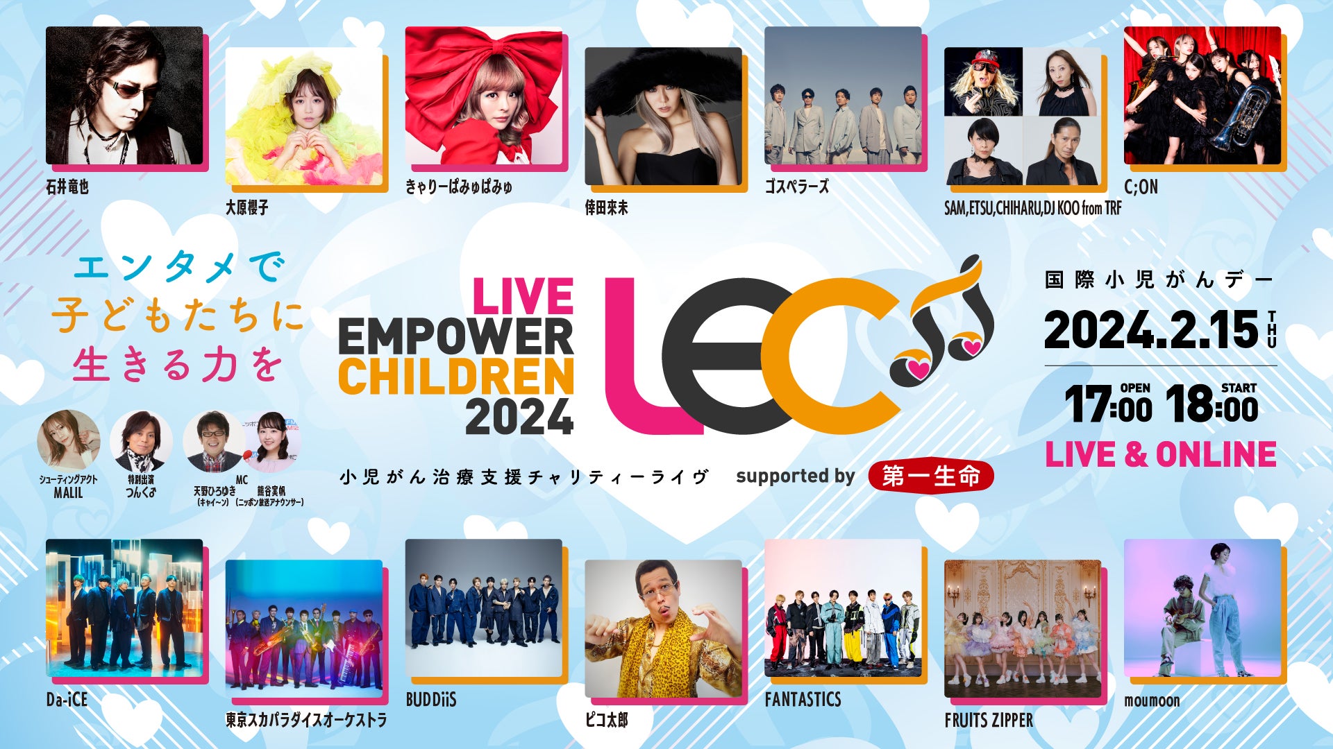 小児がんと闘っている子どもたちとご家族の皆さまを「音楽で元気づけたい」という我々の強い想いにご賛同いただいたアーティストや企業の皆さまからのご支援により、“エンタテインメントは、子どもたちの「生きる力」をつくる。” をテーマにした、小児がんと闘う子どもたちや、そのご家族を元気づけるためのチャリティーライヴ【LIVE EMPOWER CHILDREN 2024 supported by 第一生命保険】を開催いたします。