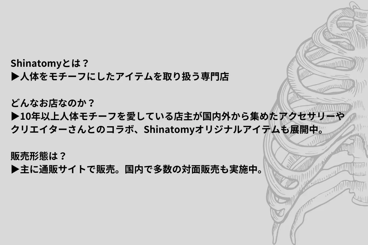 そんな人体モチーフのアイテムを皆さんに知ってもらいお届けすることで、自己表現のお手伝いができたらという思いから「Shinatomy」を運営しています。