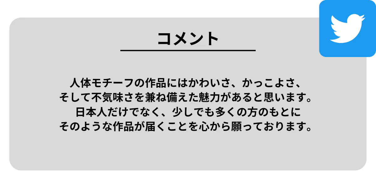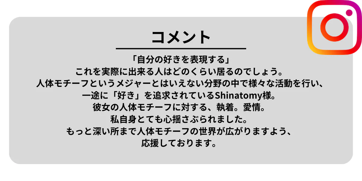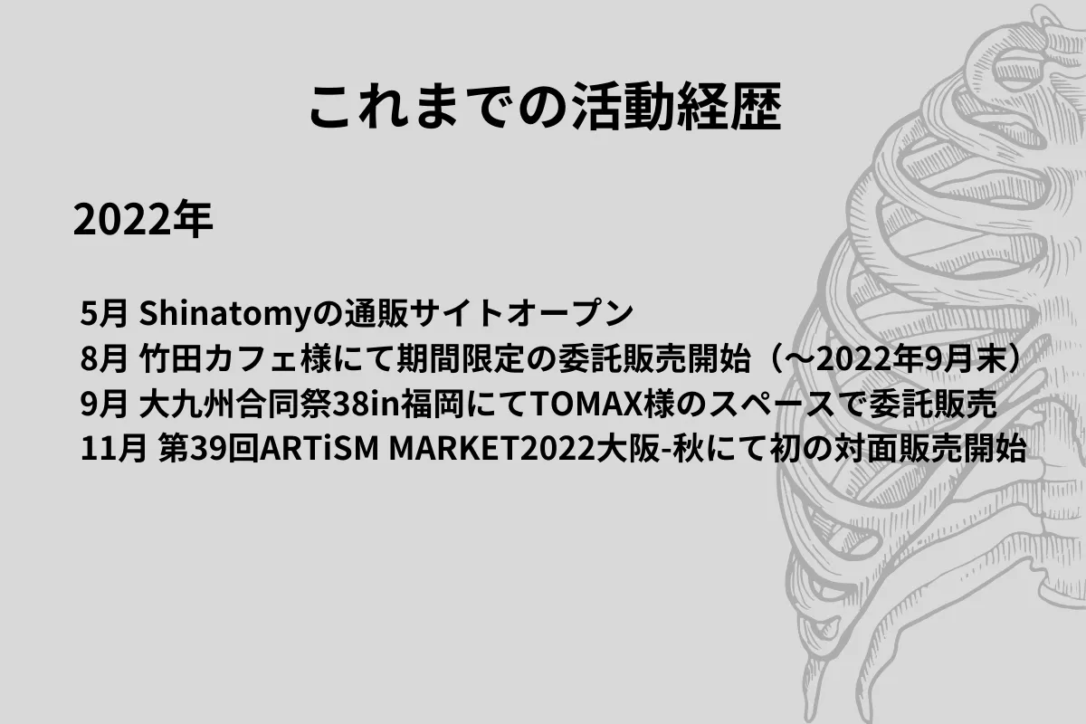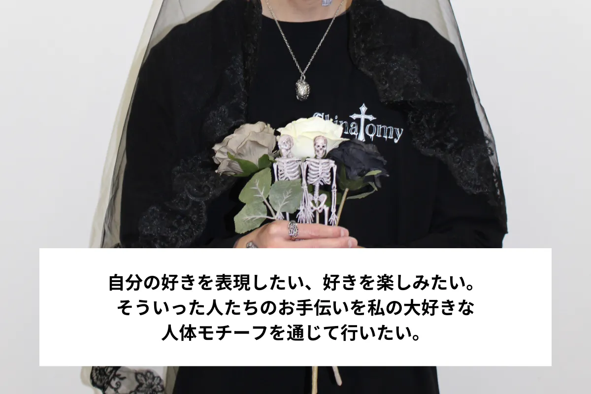 上記の経験を通じて、私は皆さんの好きを表現するお手伝いを、人体モチーフ好きな私が人体モチーフ、そしてShinatomyを通じて実行したいです。