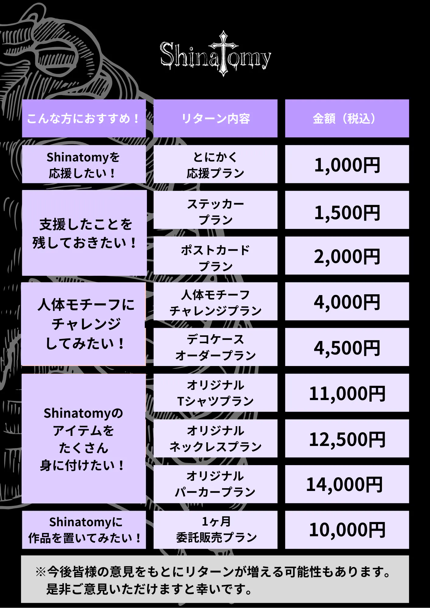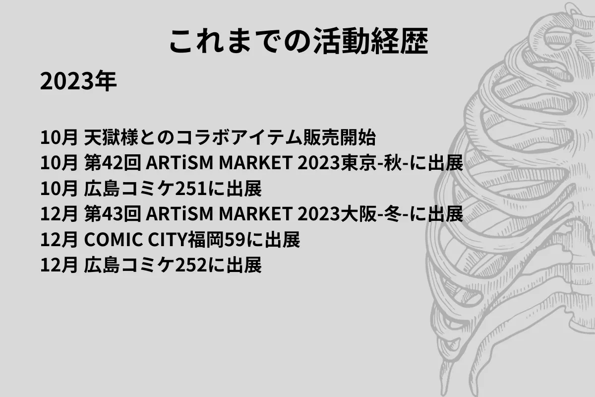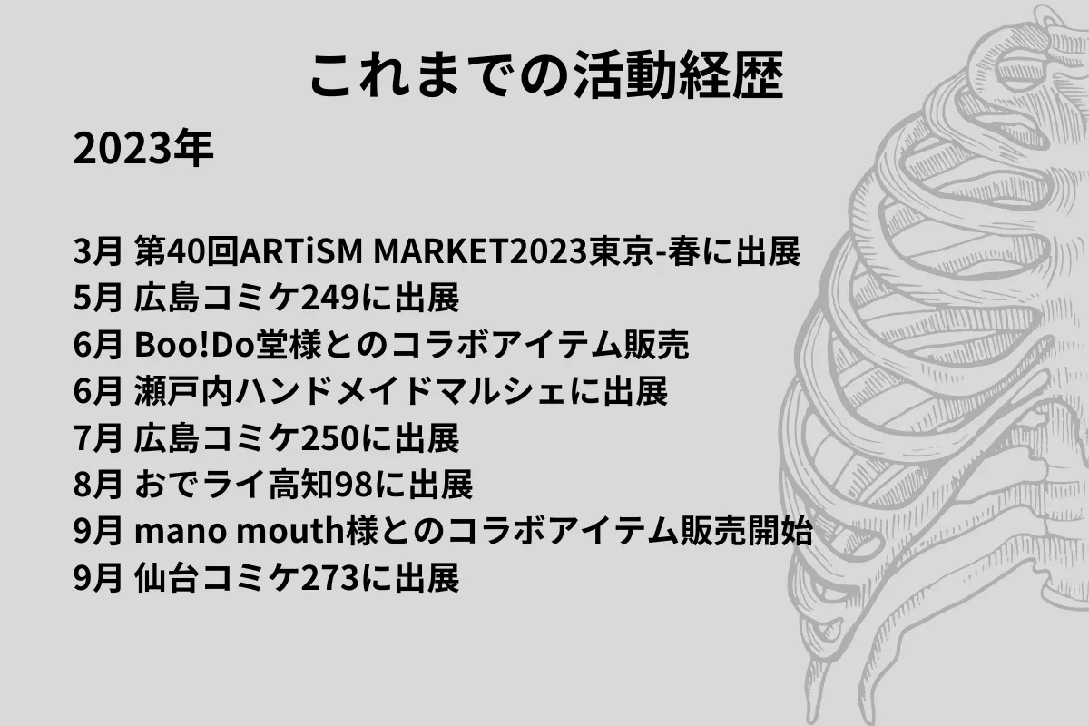 上記の経験を通じて、私は皆さんの好きを表現するお手伝いを、人体モチーフ好きな私が人体モチーフ、そしてShinatomyを通じて実行したいです。