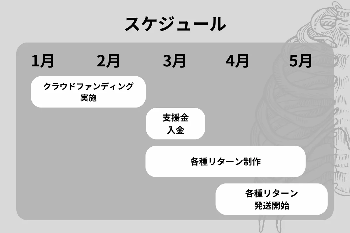 ※リターンのスケジュールについては、製造工程上の都合や配送作業に伴うやむを得ない事情によりお届けが遅れる場合がございます。上記を含むプロジェクトページに記載している内容に変更がある場合は、できるだけ早く活動報告などで共有いたします。予めご了承ください。