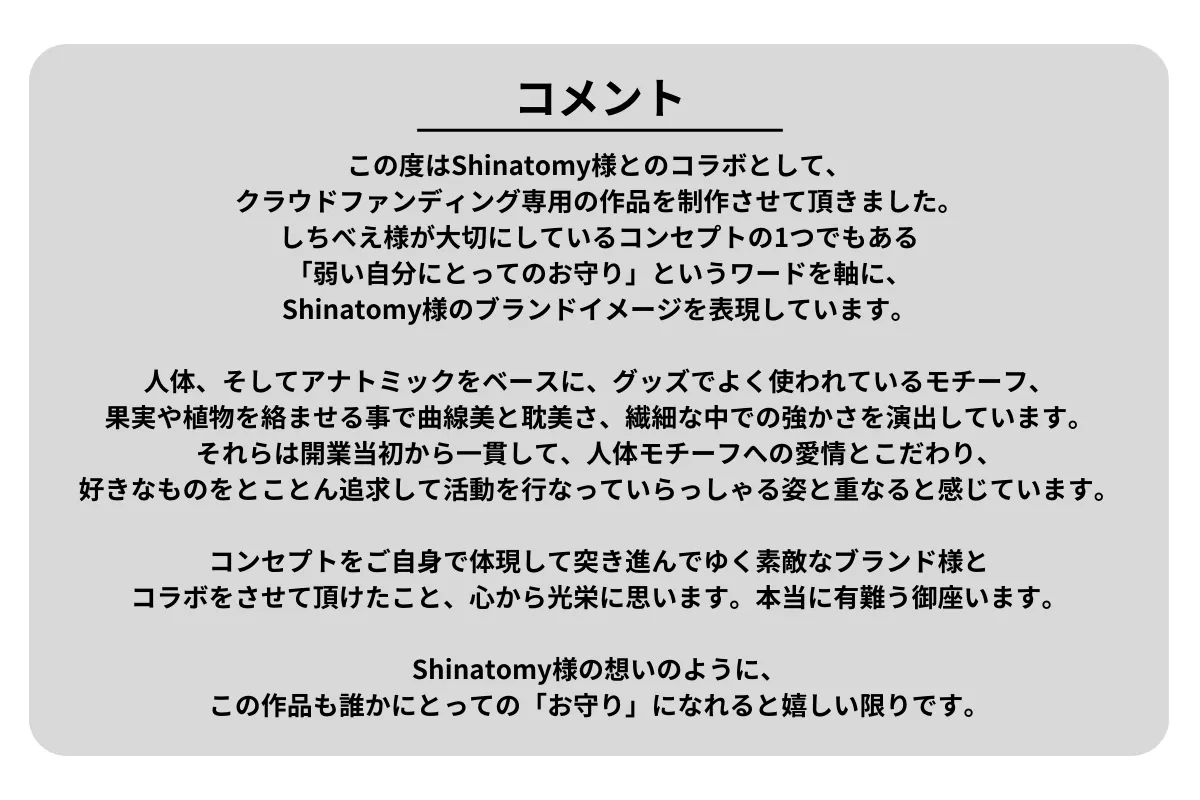 イラスト制作の意図と共にShinatomyへの応援コメントも掲載しておりますのであわせてご覧ください。